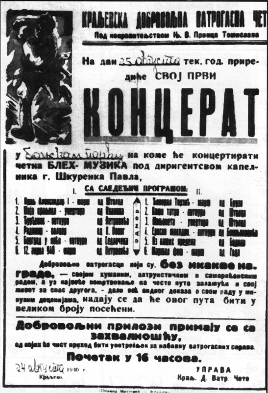 Kapelnik vatrogasne muzike bio je Pavle Škurenko, koji je od 1939. godine preuzeo rukovođenje orkestrom. Te godine orkestar dobija i svoje ime „Bleh muzika doborovoljne vatrogasne čete. Umesto tog dugačkog naziva, Kraljevčani su upotrebljavali jednostavniji naziv „vatrogasna muzika".